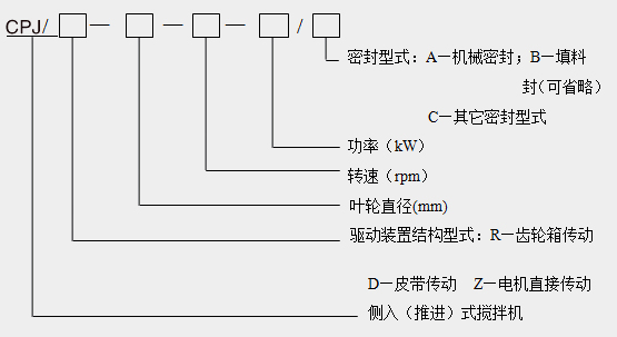 CPJ型側入式皮帶攪拌機由電機、皮帶盤、機架、機械密封、堵漏裝置、攪拌軸、攪拌器等組成。根據密封方式可分為:A型:機械密封,B型:填料密封,C型:其它密封方式,可適用于不同密封要求的場合。安裝方式為臥式安裝,也可根據現場工藝條件調整安裝方式。